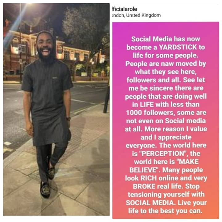 “Social Media has now become a YARDSTICK to life for some people. People are now moved by what they see here, followers and all. See let me be sincere there are people that are doing well in LIFE with less than 1000 followers, some are not even on Social media at all. More reason I value and I appreciate everyone, he wrote.