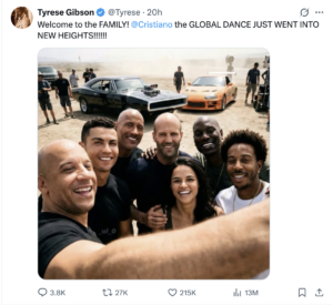 Gibson’s post on X (formerly Twitter) featured a smiling Ronaldo with the familiar faces of the franchise, captioned: “Welcome to the FAMILY! @Cristiano the GLOBAL DANCE JUST WENT INTO NEW HEIGHTS!!!!!!” — igniting widespread debate online about whether the soccer superstar has officially signed on to appear in the next film.