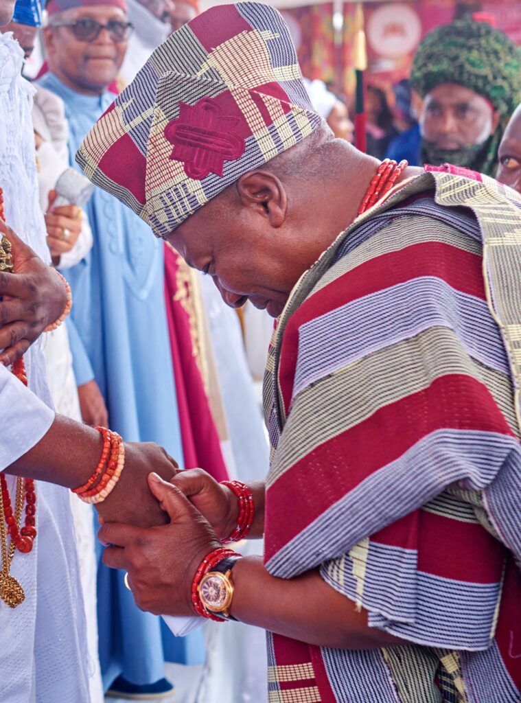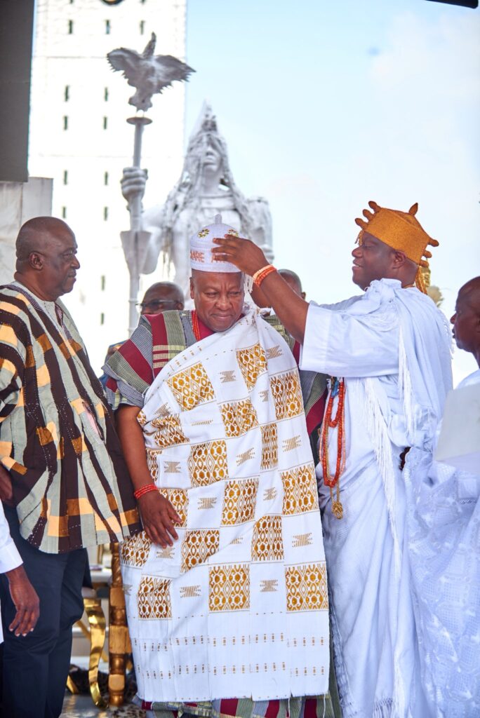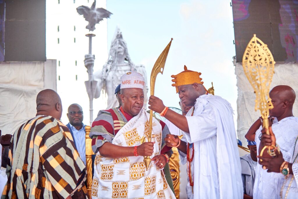 Photos as Ghana’s sitting President, His Excellency, John Mahama is conferred the tittle of Aare Atayeto Oodua by the Ooni of Ife, Oba Adeyeye Ogunwusi in Nigeria.
