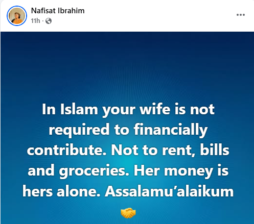 Nafisat pointed out that any income earned by a woman remains her exclusive property, and any monetary assistance she offers to the family is voluntary, not compulsory. She remarked, “Islam does not require a wife to cover rent, utility bills, or groceries. Her earnings belong entirely to her.” This viewpoint challenges conventional norms that often expect women to bear financial responsibilities in marriage.