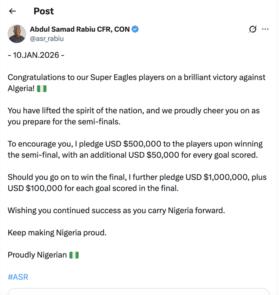 Rabiu made the pledge public in a statement shared on X (formerly Twitter) on January 10, 2026, following Nigeria’s victory over Algeria. He praised the players for lifting national morale and outlined detailed rewards tied to their performance in the remaining stages of the tournament.