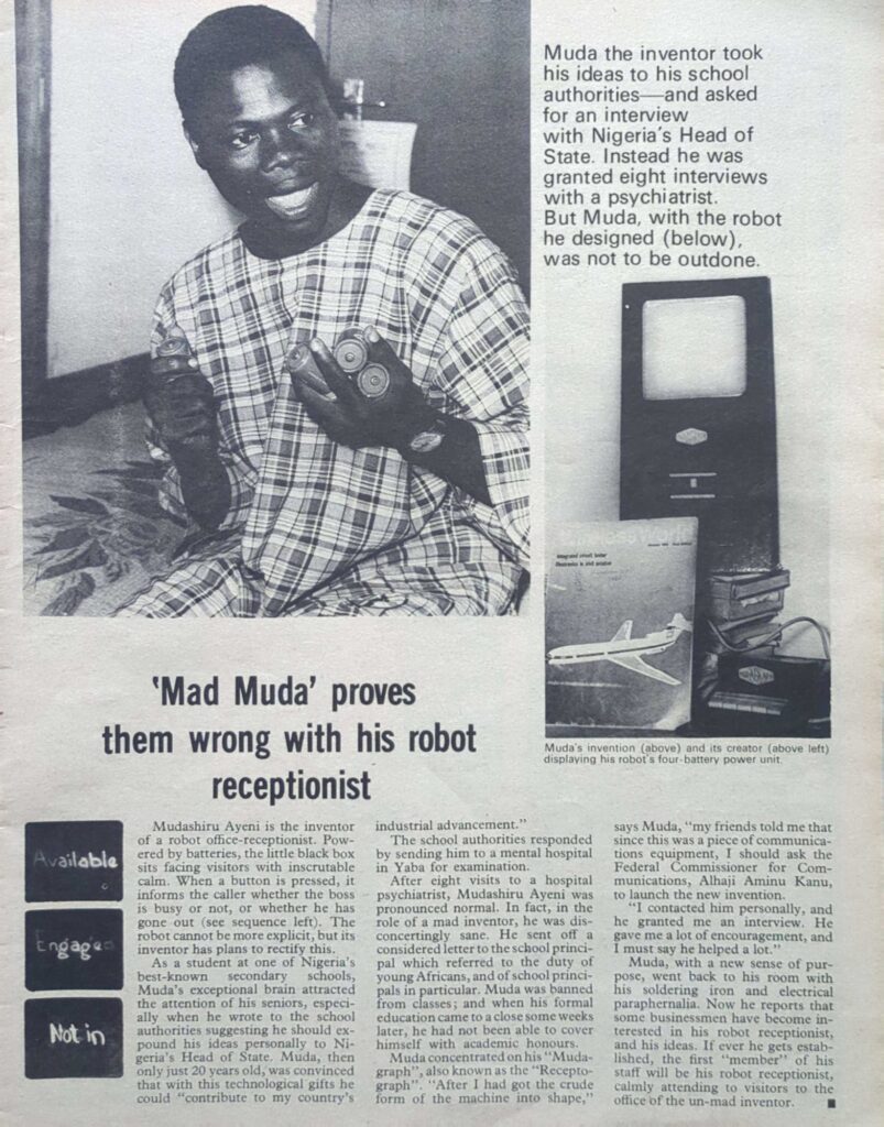 Ayeni’s invention, as described in the 1971 story, functioned as an automated office assistant. At the press of a button, it would inform callers whether the boss was busy, available, or away — a concept that mirrors modern automated answering systems.
