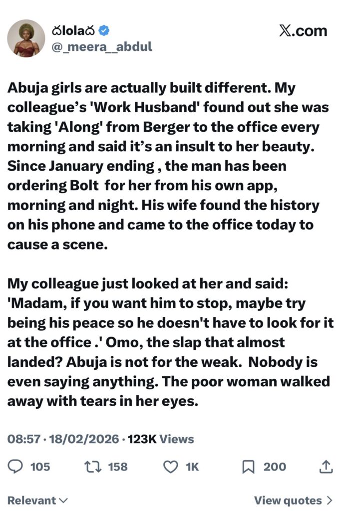 A viral post circulating on X (formerly Twitter) has sparked widespread reactions after detailing an alleged office confrontation in Abuja involving a married man, his colleague, and his wife.
