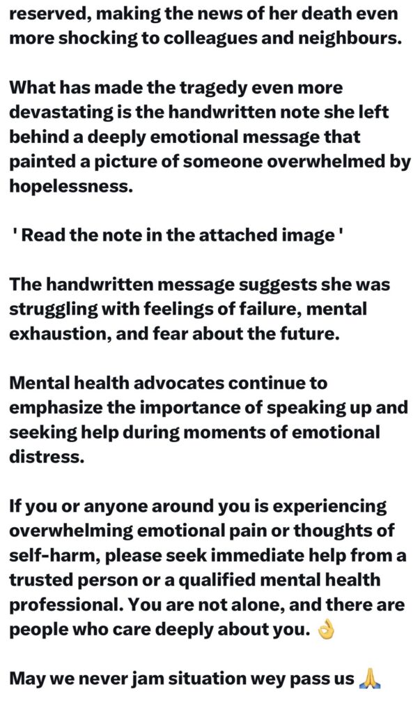 The post, shared by user @BolanleCole, describes the incident as having recently occurred and states that the woman was a staff member at a credit company in Ogba. Screenshots of what is said to be her handwritten note have also been shared online.