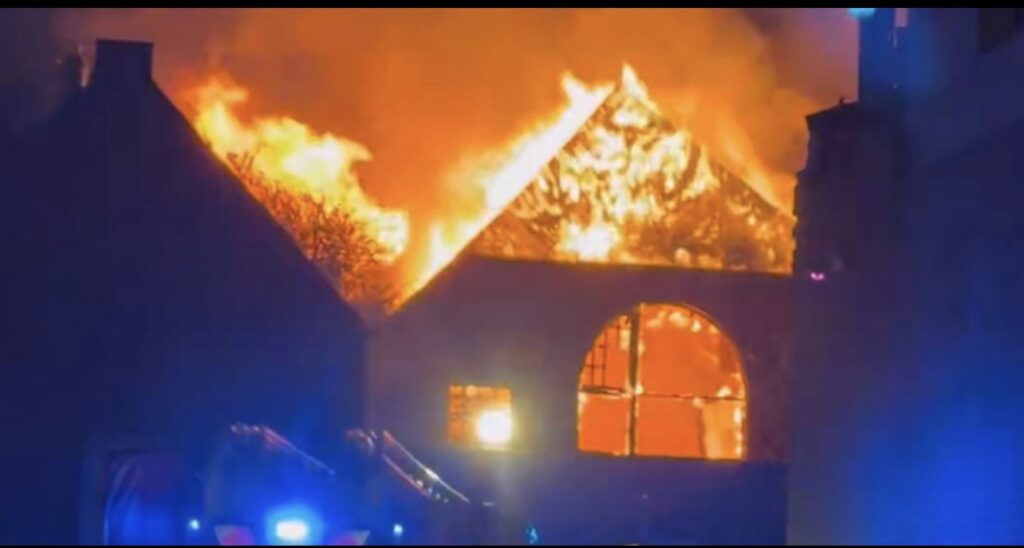 Witnesses said the fire spread through sections of the building, with flames reportedly visible through the roof and church windows as residents gathered nearby watching the incident unfold.
