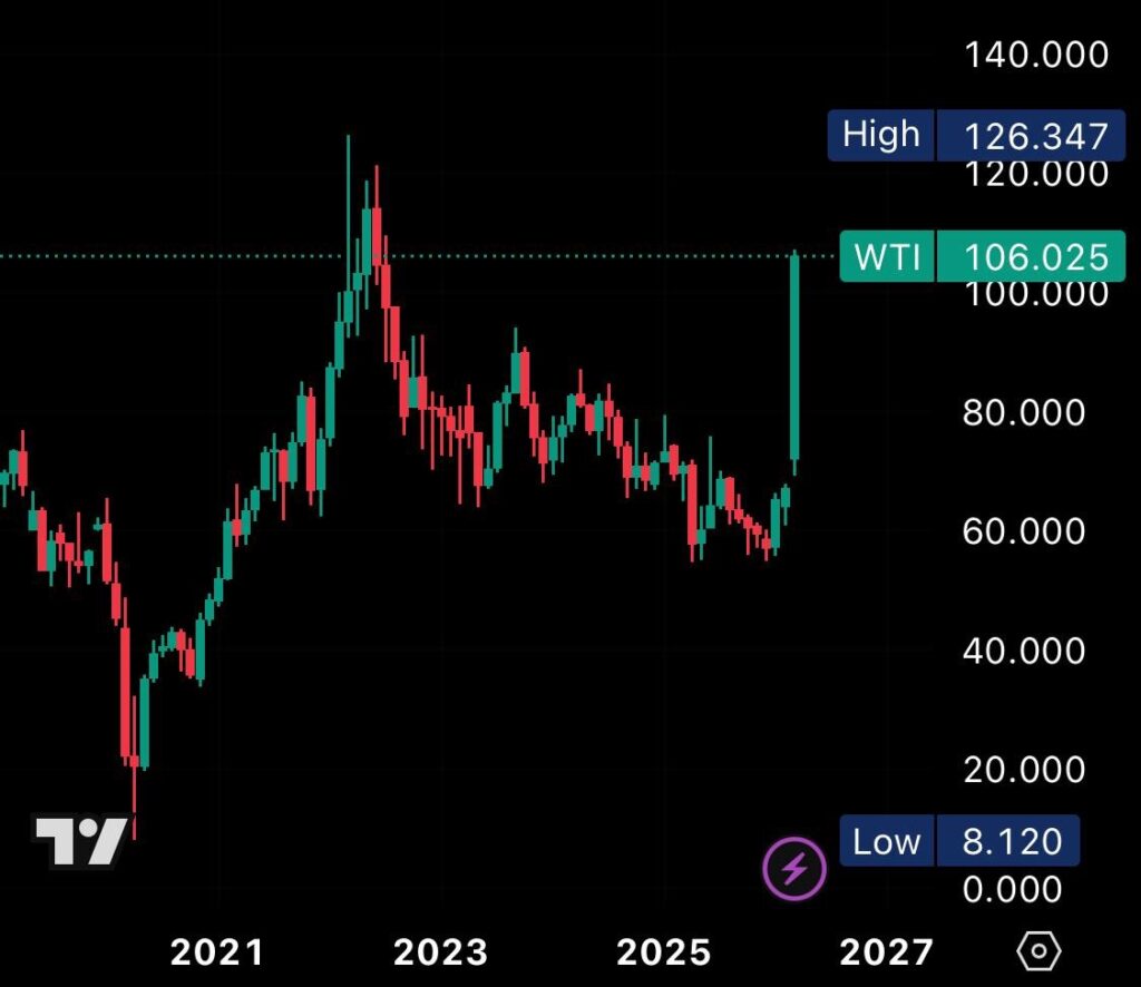 The spike follows intensified military exchanges in the region, including strikes on Iranian infrastructure and threats to shipping routes in the Strait of Hormuz, one of the most critical oil transit corridors in the world. Roughly 20% of global oil supply passes through the strait, meaning any disruption can send shockwaves through international markets.
