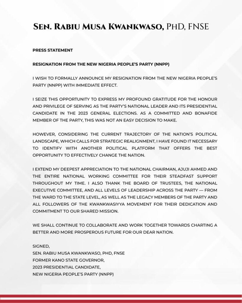 Former Kano State Governor and 2023 presidential candidate of the New Nigeria People’s Party (NNPP), Senator Rabiu Musa Kwankwaso, has announced his resignation from the party with immediate effect.